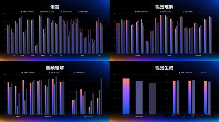 文心5.0基础能力全面升级,在多模态理解、指令遵循、创意写作、事实性、智能体规划与工具应用等方面表现突出,拥有强大的理解、逻辑、记忆和说服力。在40余项权威基准的综合评测中,其语言与多模态理解能力与Gemini-2.5-Pro、GPT-5-High等模型持平,图像与视频生成能力与垂直领域专精模型相当,达到全球领先水平,验证了原生全模态大模型的能力和潜力。
